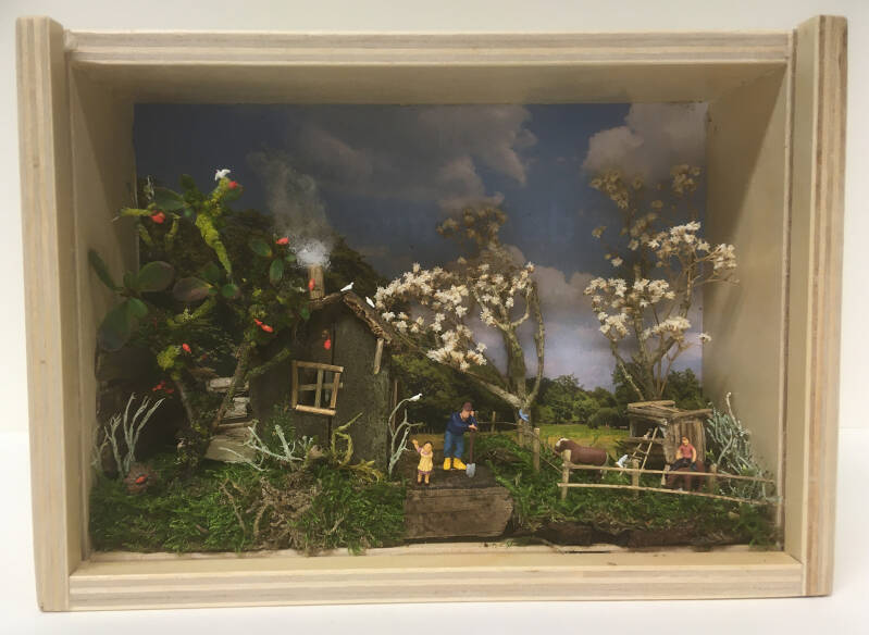 Tuin, schuurtje, duifjes, kippenhok, pony's, kindjes, opa.